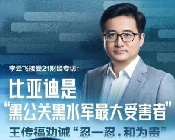 速途网12月27日消息(报道:龙翔)。近日,比亚迪集团品牌及公关总经理李云飞在接受21世纪经济报道视频专访时,对公众所关注的车圈黑公关问题做出了回应。李云飞表示,比亚迪从来不拉踩别人,因为树大招风,比亚迪才是这个行业黑公关黑水军的最大的受害者。