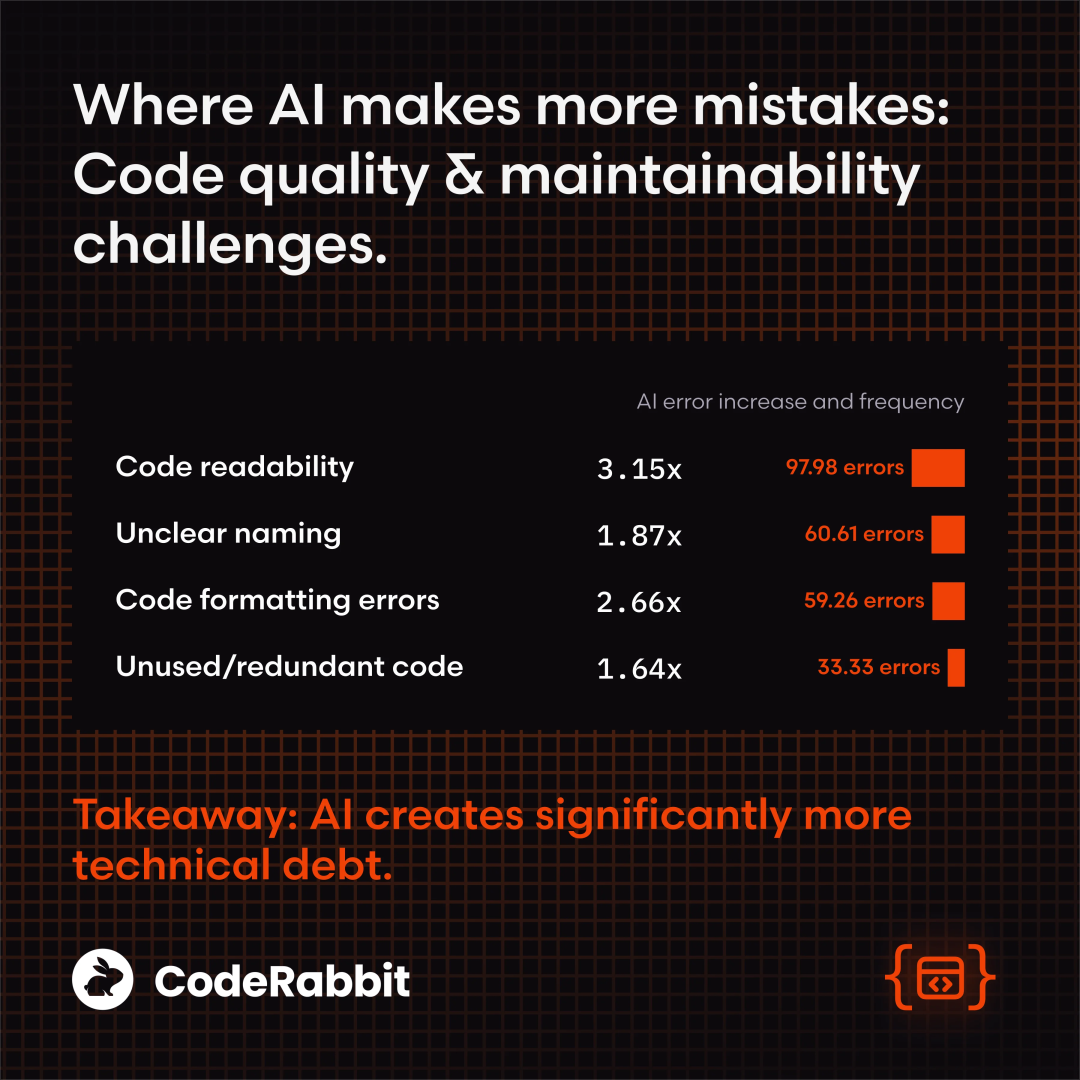 CodeRabbit的报告指出,这些问题正在像滚雪球一样累积成巨大的「长期技术债」。