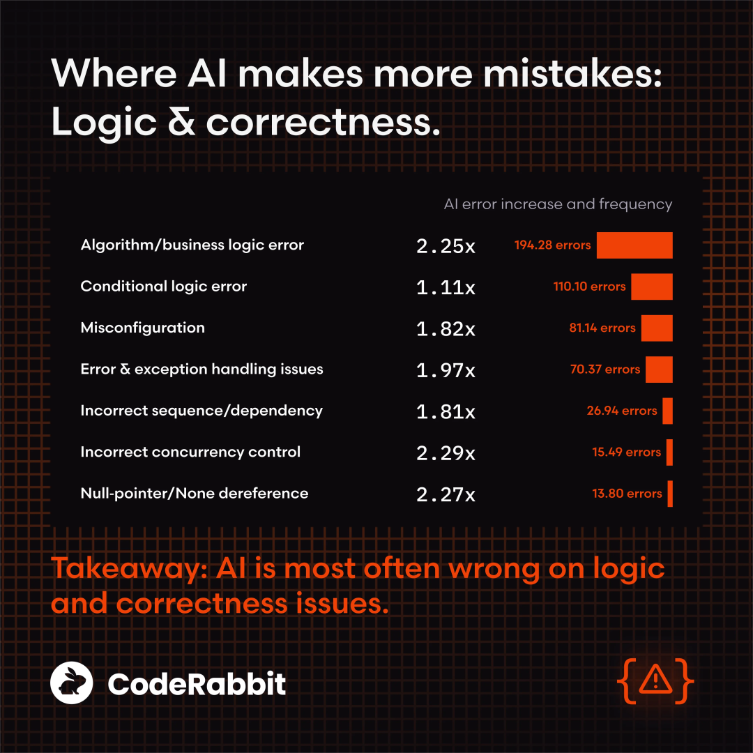 尽管AI在拼写和语法上比人类强两倍,然而一旦出错,就会上升到那种——深层次的逻辑谬误、功能正确性缺失以及代码可读性灾难。
