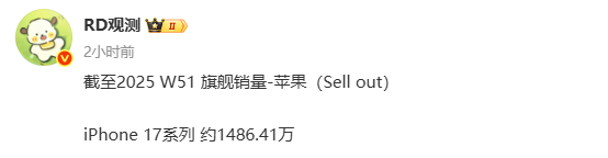 【CNMO科技消息】12月27日,有数码博主透露,截至2025年第51周,苹果iPhone 17系列在中国市场的累计销量已达约1486.41万台。该系列于2025年9月10日发布,9月19日正式开售,包含iPhone 17、iPhone Air、iPhone 17 Pro和iPhone 17 Pro Max四款机型,全系取消128GB入门存储,统一以256GB起步。