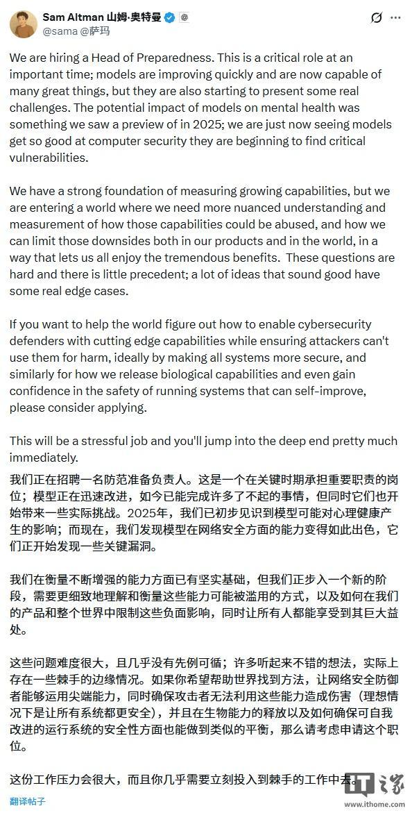 OpenAI 首席执行官山姆・奥尔特曼在社交平台 X 上发布的该职位相关帖子中坦言,“2025 年,我们已初步窥见模型对心理健康可能产生的影响”,此外,伴随模型能力提升而来的还有诸多“切实挑战”。他表示,安全防范负责人“在当下这个关键时期,是一个至关重要的岗位”。