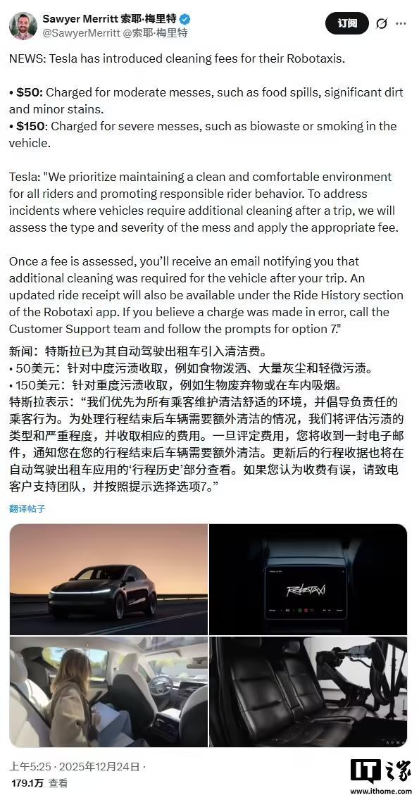 IT之家 12 月 28 日消息,特斯拉自动驾驶出租车(Robotaxi)服务新增了一个极其贴近现实的功能:乘客若在后座呕吐弄脏车辆,需支付清洁费。