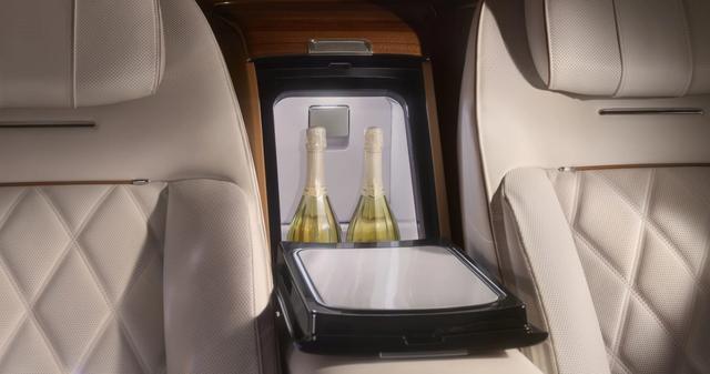 这还没完,在后排座椅的中间,尊界S800安排了一个似乎很常见的车载冰箱。