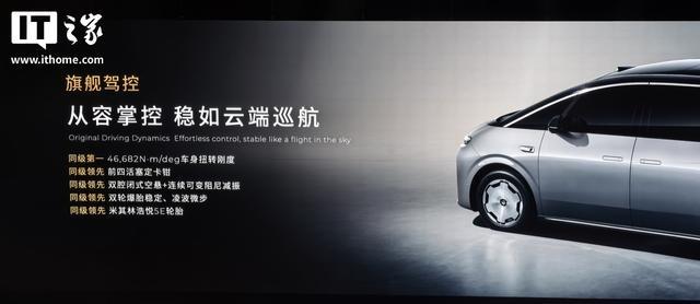 操控方面,该车具备同级第一 46,682N・m/deg 车身扭转刚度、同级领先前四活塞定卡钳、同级领先双腔闭式空悬 + 连续可变阻尼减振、同级领先双轮爆胎稳定、凌波微步、同级领先米其林浩悦 5E 轮胎。