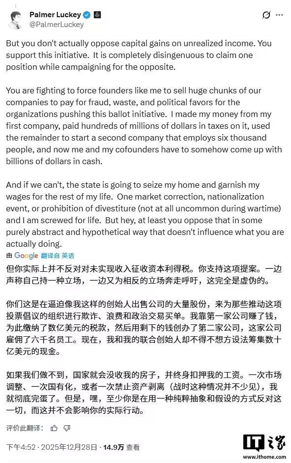 防务科技初创企业 Anduril 联合创始人帕尔默・勒基警告称,这项税收将迫使企业创始人抛售大量公司股权,以支付那些“为推动该投票提案的组织输送利益、滋生腐败与浪费的成本”。