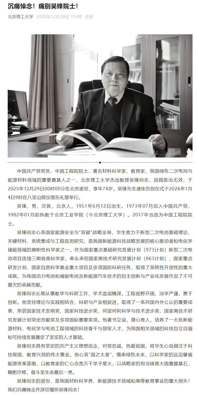 IT之家 12 月 29 日消息,北京理工大学今日发布讣告,中国工程院院士、著名材料科学家、教育家、我国绿色二次电池与能源材料领域的重要奠基人之一、北京理工大学杰出教授吴锋同志,因病医治无效,于 2025 年 12 月 29 日 00 时 00 分在北京逝世,享年 74 岁。