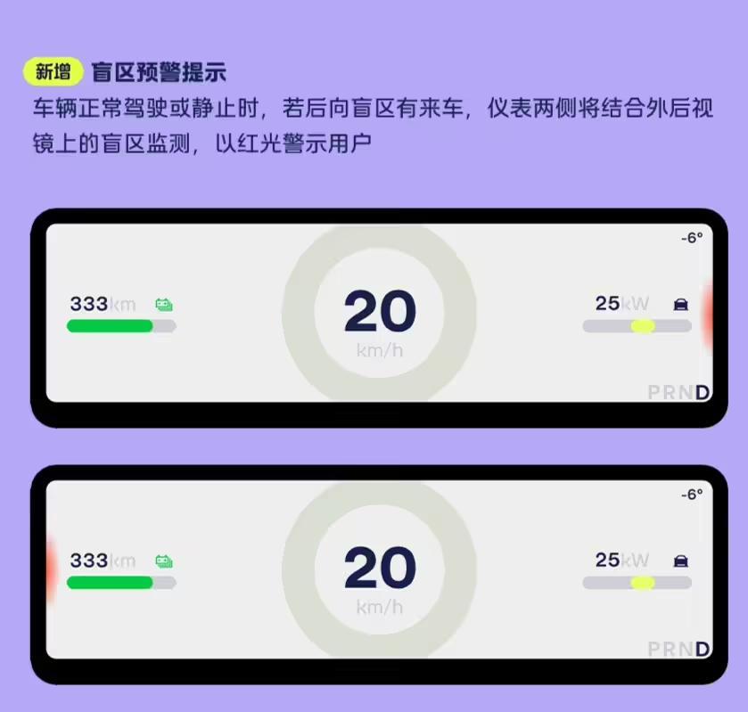 车辆正常驾驶或静止时,若后向盲区有来车,仪表两侧将结合外后视镜上的盲区监测,以红光警示用户。