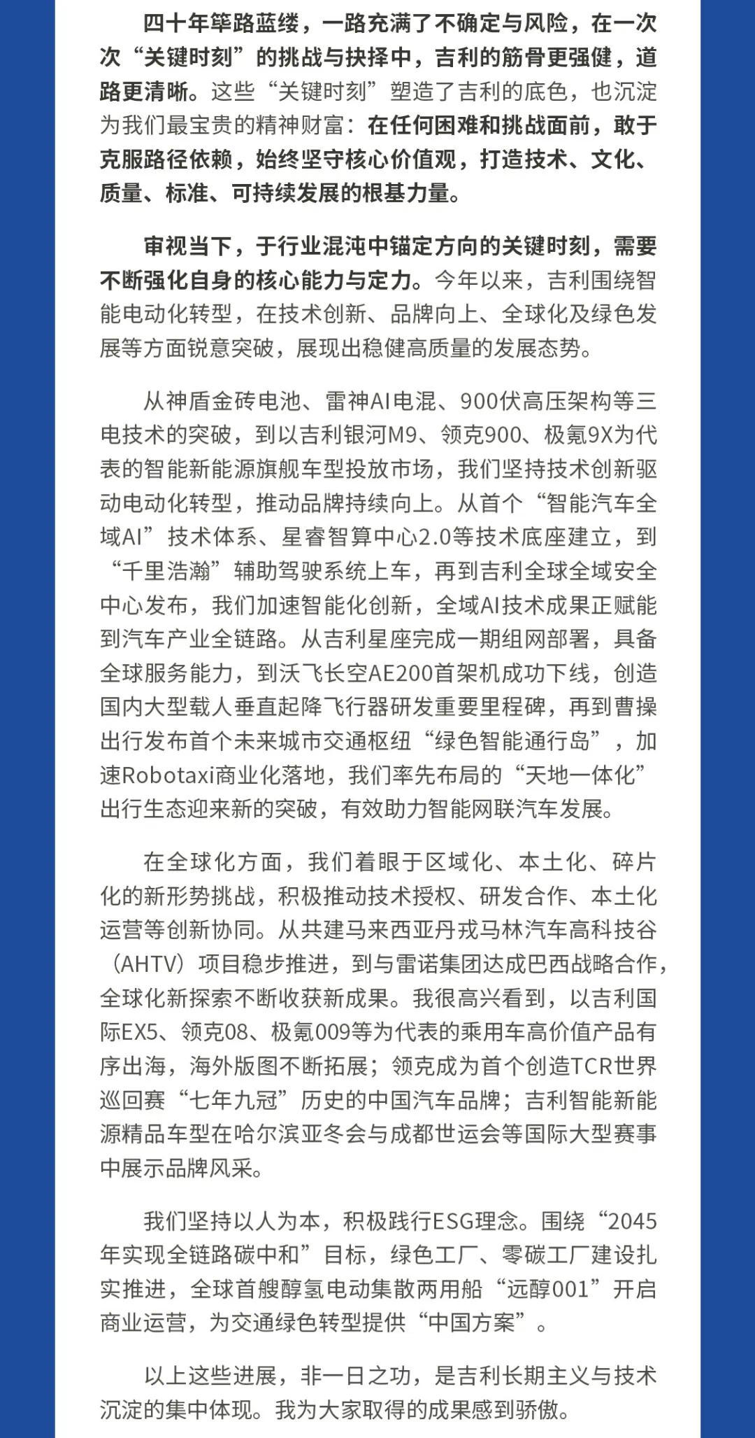 展望未来,李书福认为,无论技术、市场如何变革,以人为本的安全、绿色、愉悦的出行体验始终是汽车产业不变的核心。为此,吉利将持续强化在技术创新、人才培养方面的投入。