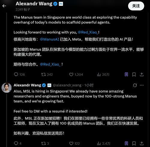 Meta超级智能实验室(MSL)负责人Alexandr Wang(汪韬)也转发了相关消息,并配文称Manus团队在探索当今模型的能力过剩问题上,处于世界一流水平。此外,MSL正在新加坡招聘,Manus团队的100名成员已经加入MSL在当地的组织。
