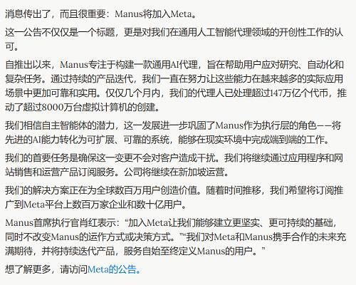 Meta在公告中称,此次收购旨在将领先的通用型自主Agent能力带给数十亿用户,计划将这项服务推广到更多企业。