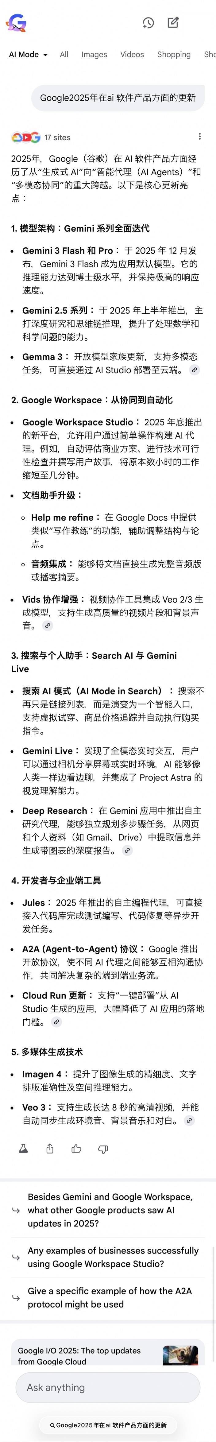 说到浏览器,Google 的老本行搜索也在这一年,有了全新的 AI 模式。AI Mode 的出现,让搜索结果变得更像一个过程,而不是终点。