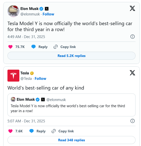 马斯克:特斯拉Model Y连续三年成为全球最畅销汽车 凤凰网科技讯 12月31日,马斯克在X上发文:“特斯拉Model Y现已正式连续第三年成为全球最畅销汽车!”随后,特斯拉官方账号转发了该条内容,并附文强调其“全球最畅销车型”的地位。 此外,特斯拉于12月30日通过其官方微博宣布,全球第900万辆电动汽车于其上海超级工厂正式下线。2023年以来,Model Y一直表现强劲,凭借其性价比高昂以及实用性、性能和科技的卓越结合,超越了丰田RAV4和卡罗拉等传统领先车型。Model Y还被誉为路上最安全的车辆之一,是中国等关键市场家庭的理想选择。 Published by 风君子 独自遨游何稽首 揭天掀地慰生平 View all posts by 风君子