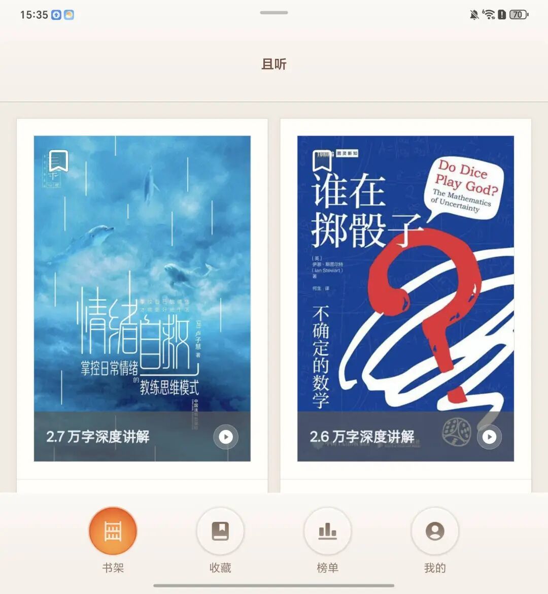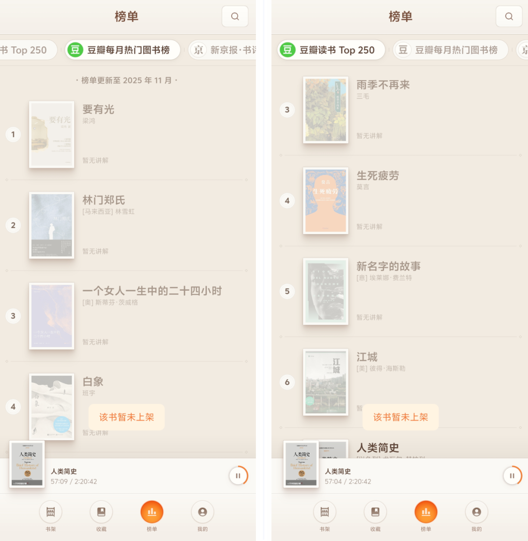 功能上倒也没太多花活,「且听」提供了深度内容库、权威榜单、拟真 AI 音色、文音对照,都是围绕「高效听书」做的加法。