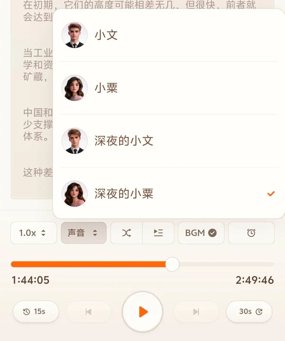 更深层的亮点,是「且听」精准抓住了传统听书产品的命门。现在市面上的听书产品,大多是是 TTS 机械朗读;「且听」靠 AI 加持,小文、小栗等拟真音色听起来比较自然,没有明显的机械感,体验上更胜一筹。