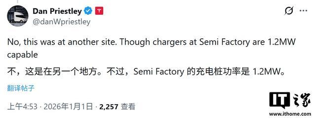 IT之家 1 月 1 日消息,特斯拉 Semi 官方 X 账号昨日(2025 年 12 月 31 日)发布推文,分享了一段视频,展示了 Semi 电动卡车在 Megacharger 充电站的实测表现,其持续充电功率达到惊人的 1.2 兆瓦(MW)。