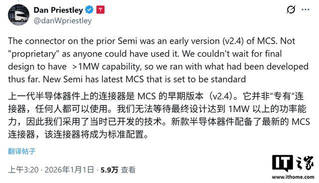 特斯拉 Semi 项目负责人 Dan Priestley 证实,新版卡车已标配最新的兆瓦级充电系统(MCS)接口,彻底取代了早期的 v2.4 版本。