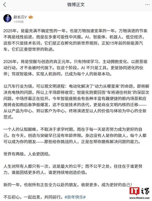 IT之家 1 月 1 日消息,前比亚迪腾势品牌总经理、腾势方程豹直营事业部总经理赵长江今日发布长文,分享了自己对行业的看法。他表示,AI、智能体、机器人、低空经济这些不只是技术名词,是正在孵化的新世界规则,正如 15 年前的新能源汽车,正重塑世界的轨迹。