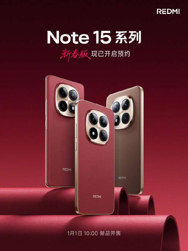 【CNMO科技消息】1月1日元旦,REDMI Note15系列新春版于上午10点正式开售。此次推出的新年版包含三款机型,均采用限定配色。其中标准版和Pro版采用鲜亮喜庆的“车厘子红”配色,而定位更高的Pro+版则配备了更显沉稳高级的“摩卡棕”。