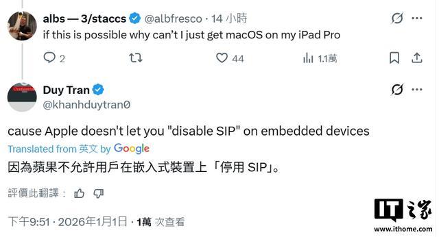 后续,Duy Tran 还表示,iPad Pro 之所以运行不了 macOS 是因为苹果不允许在嵌入式设备上禁用 SIP(系统完整性保护),同时由于驱动没有完全打上,游戏之类的 App 也无法运行,并且要复现这些操作需要将手机越狱。