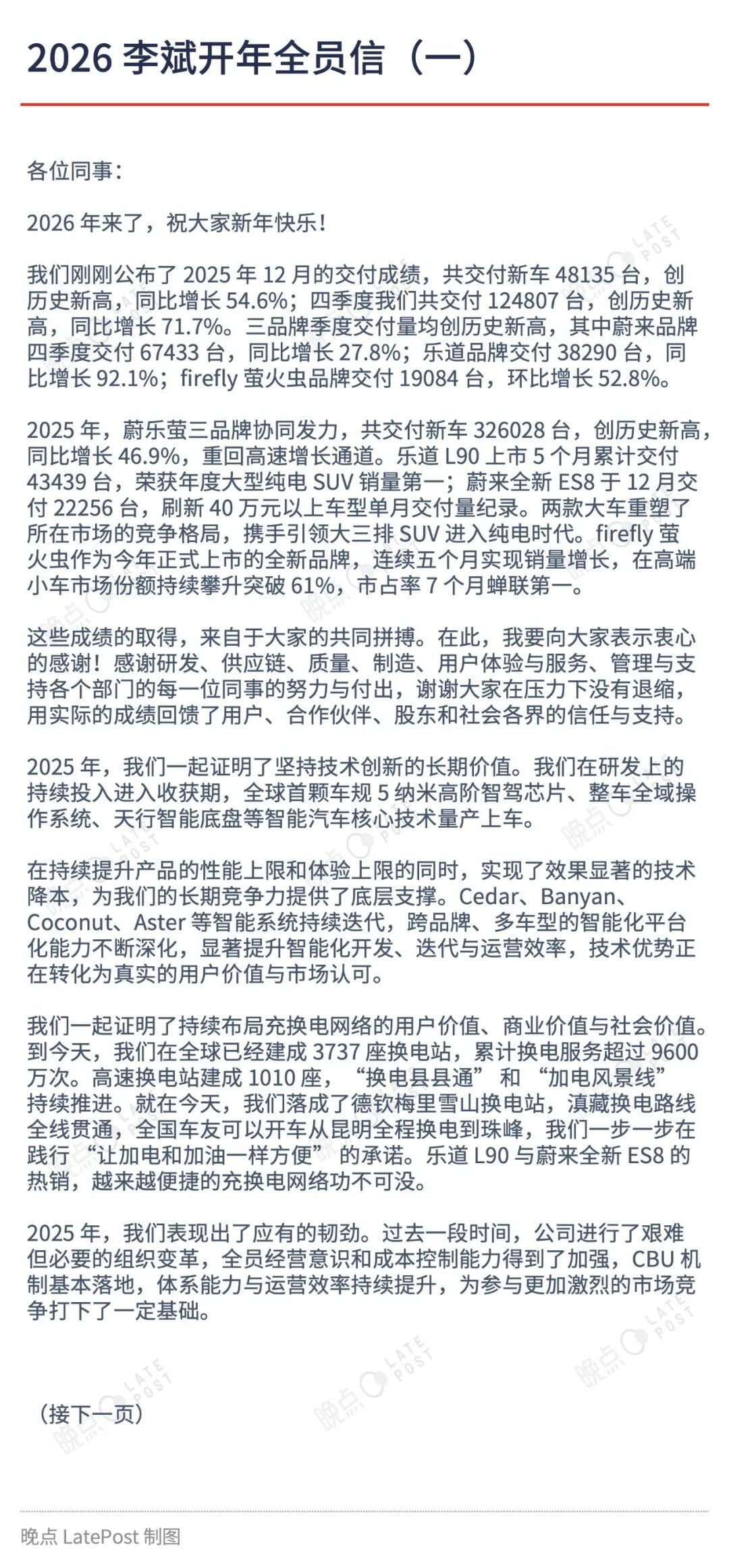 他在信中肯定了蔚来过去一年取得的成绩。蔚来在2025年共交付新车超过32.6万辆,创下年度交付历史新高。他透露,公司在过去一年实施了“艰难但必要”的组织变革,通过强化全员经营意识与严格的成本控制,成功提升了体系能力,认为蔚来已逐步走出经营谷底。