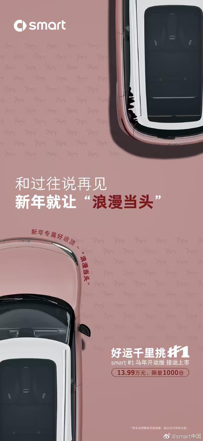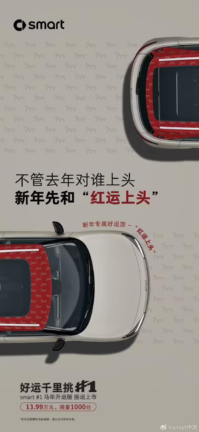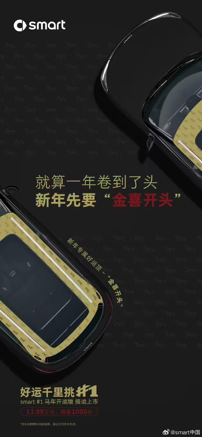 IT之家 1 月 2 日消息,smart 精灵#1 马年开运版于 1 月 1 日上市,售价 13.99 万元,限量 1000 台。下定用户可享受好运专属礼、好运服务礼、好运置换礼和好运复购礼。