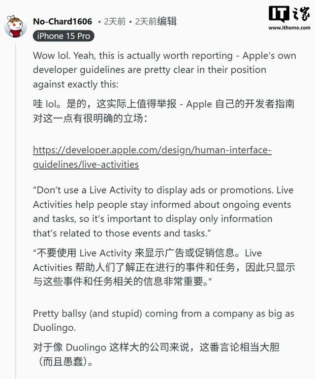 同时根据 Reddit 论坛的多位用户反馈,他们的锁屏界面以及灵动岛确实出现了多邻国的广告。