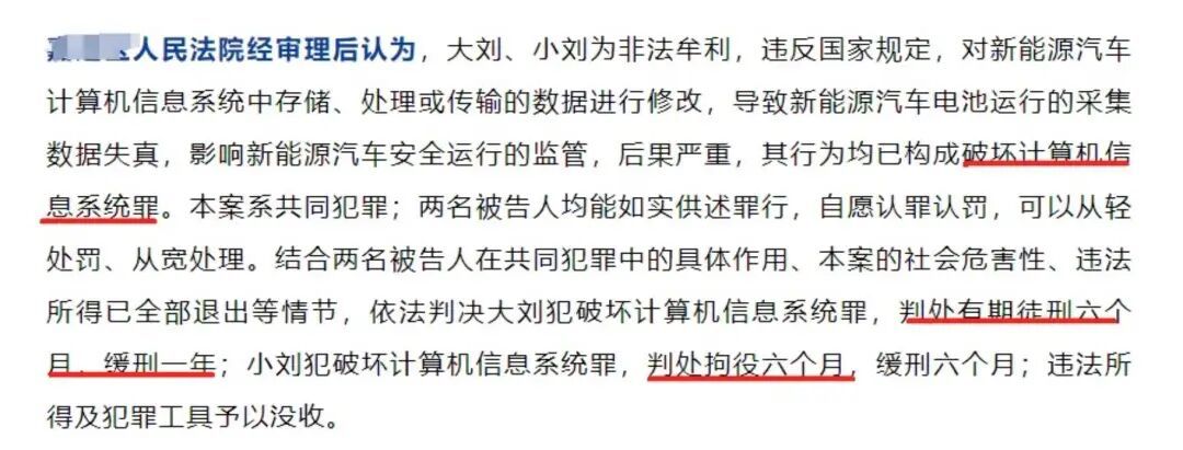 《经济观察报》曾经报道过一个案例,上海的两位修车师傅「大刘和小刘」在 2024 年因为「解锁」了两块被锁定的新能源车电池包,被告上法庭,后被上海市嘉定区人民法院判处「破坏计算机信息系统罪」,大刘被判有期徒刑 6 个月,缓刑 1 年;小刘被判拘役 6 个月,缓刑 6 个月;违法所得及犯罪工具予以没收。