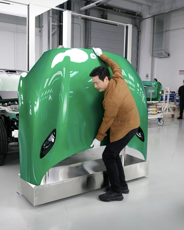 雷军还现场搬起拆下来的前机盖,他表示小米 YU7 前机盖采用的材质是全铝,有助于实现整车的轻量化。