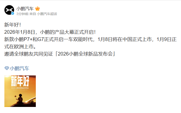 2026小鹏新款P7+、G7定档:1月8日中国上市,1月9日欧洲上市 凤凰网科技讯 1月4日,小鹏汽车通过官方社交账号宣布,将于2026年1月8日举行全球新品发布会。届时,新款小鹏P7+与G7车型将正式亮相。 据官方信息,这两款新车将开启所谓“一年双能时代”,并于1月8日在中国市场率先上市,1月9日在欧洲市场上市。发布活动定名为“2026小鹏全球新品发布会”。 Published by 风君子 独自遨游何稽首 揭天掀地慰生平 View all posts by 风君子