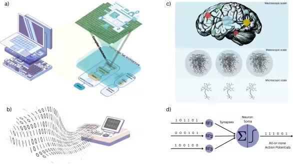 其次,生物计算在尺度上不可分离。在传统计算机中,人们可以区分算法与载体(软件和硬件);而在大脑中,这种界限并不存在。从离子通道、树突到神经回路乃至整体脑活动,各个层级相互影响。改变所谓的“实现方式”便会改变计算本身,因为二者在生物系统中是紧密交织的。