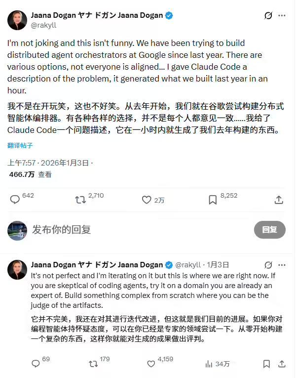 谷歌负责 Gemini API 的首席工程师亚娜・多根在 X 平台发文称,她向 Claude Code 提交了一份问题描述,仅一小时就收到了结果,这个结果与她的团队过去一年一直在构建的东西相当。这项任务的核心是分布式智能体编排器 —— 即一种能协调多个人工智能体协同工作的系统。多根透露,谷歌此前针对该问题尝试了多种技术方案,但始终未能达成共识。