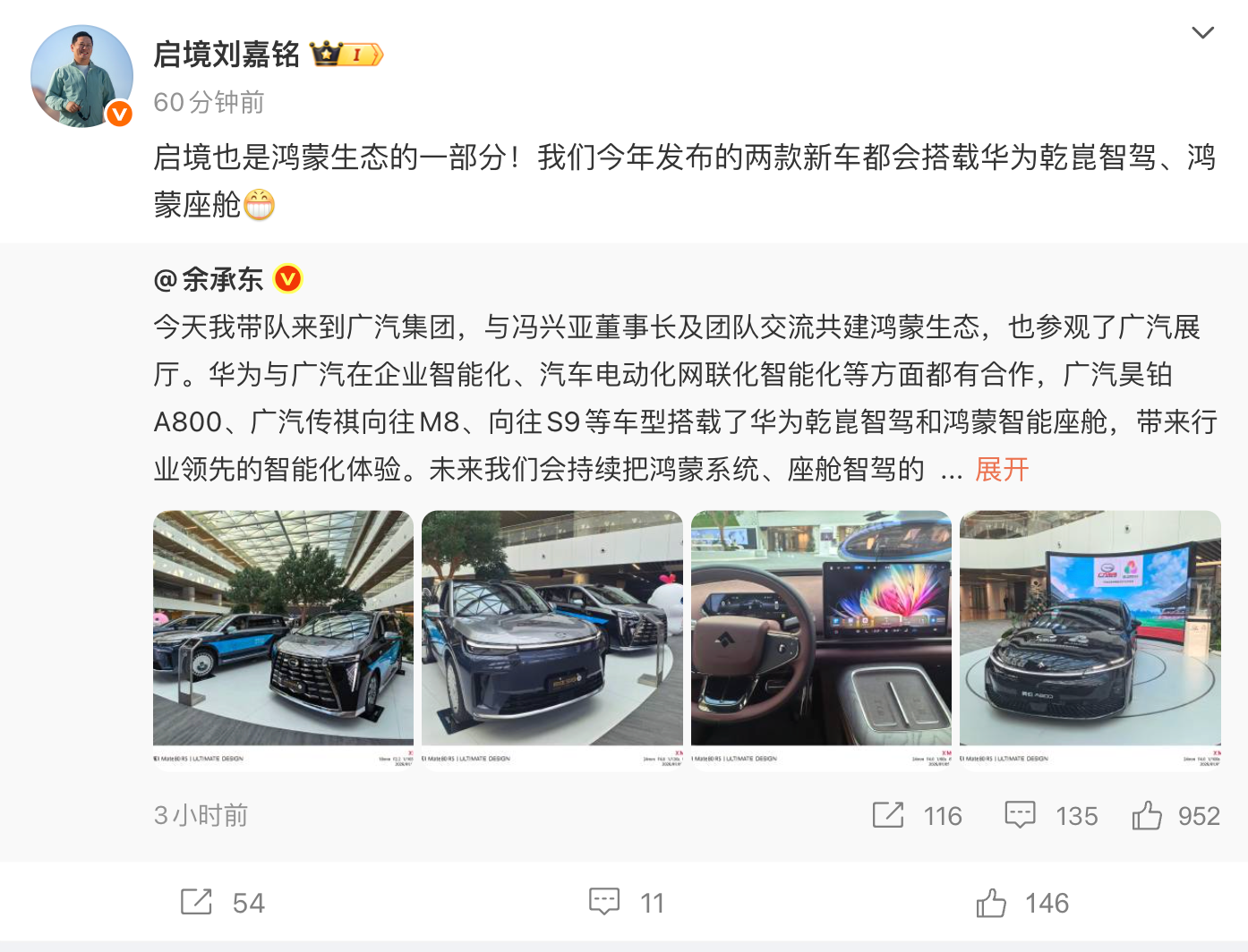 凤凰网科技讯 1月5日,启境汽车CEO刘嘉铭发文称,今年发布的两款新车都会搭载华为乾崑智驾、鸿蒙座舱。