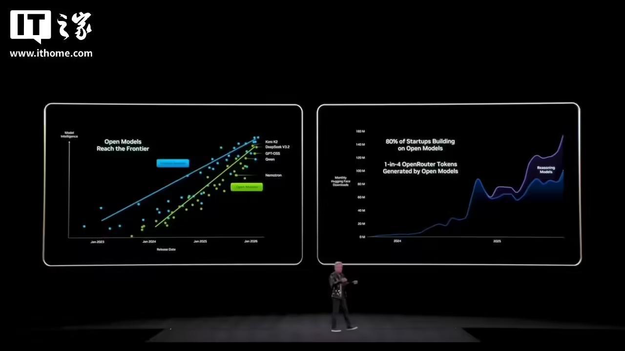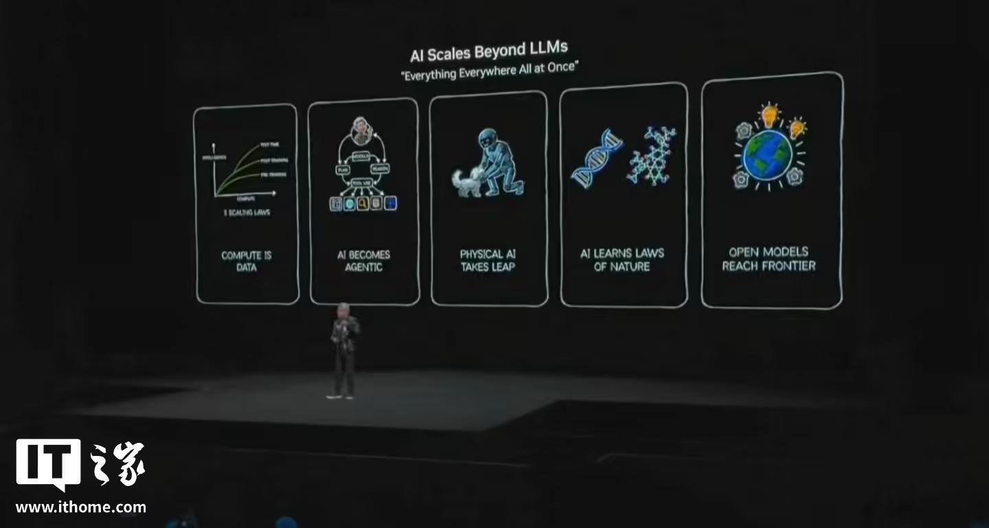 IT之家 1 月 6 日消息,在今天举办的 CES 2026 主题演讲中,英伟达首席执行官黄仁勋发表主题演讲,重点谈及了他对人工智能(AI)的观点。他表示:“人工智能正在改变世界,并且正以惊人的速度普及。我们很自豪能够继续推动这一变革。”