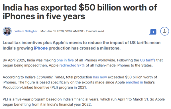 【CNMO科技消息】1月6日,据外媒报道,截止2025年12月,苹果公司通过印度的生产链出口的iPhone总额已突破500亿美元。这一数字涵盖了苹果在2021年启动的“生产联动激励(PLI)”计划期间的所有出口额。