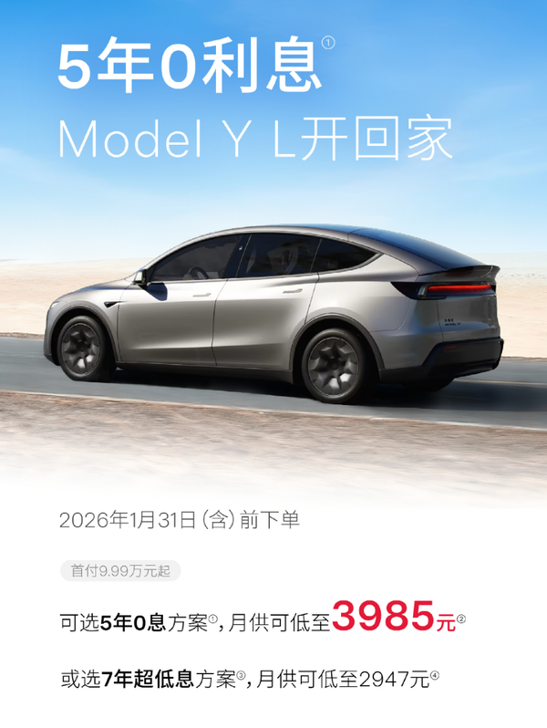 1月6日,特斯拉中国也推出了全新的金融方案:Model 3/Y/Y L可享5年0息贷款,首付7.99万元起,月供低至1918元;更首次推出7年超低息方案,年化利率仅约0.98%,大幅降低购车门槛。