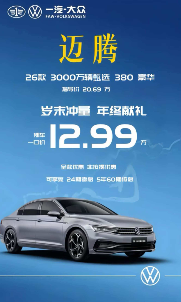 不久前,一汽-大众对迈腾展开“六折式”促销。2026款迈腾3000万辆臻选版380TSI豪华型指导价20.69万元,一口价直接降至12.99万元,优惠7.7万元;其他配置如280TSI舒适型、300TSI尊享版等,终端报价普遍下探至11万至13万元区间。
