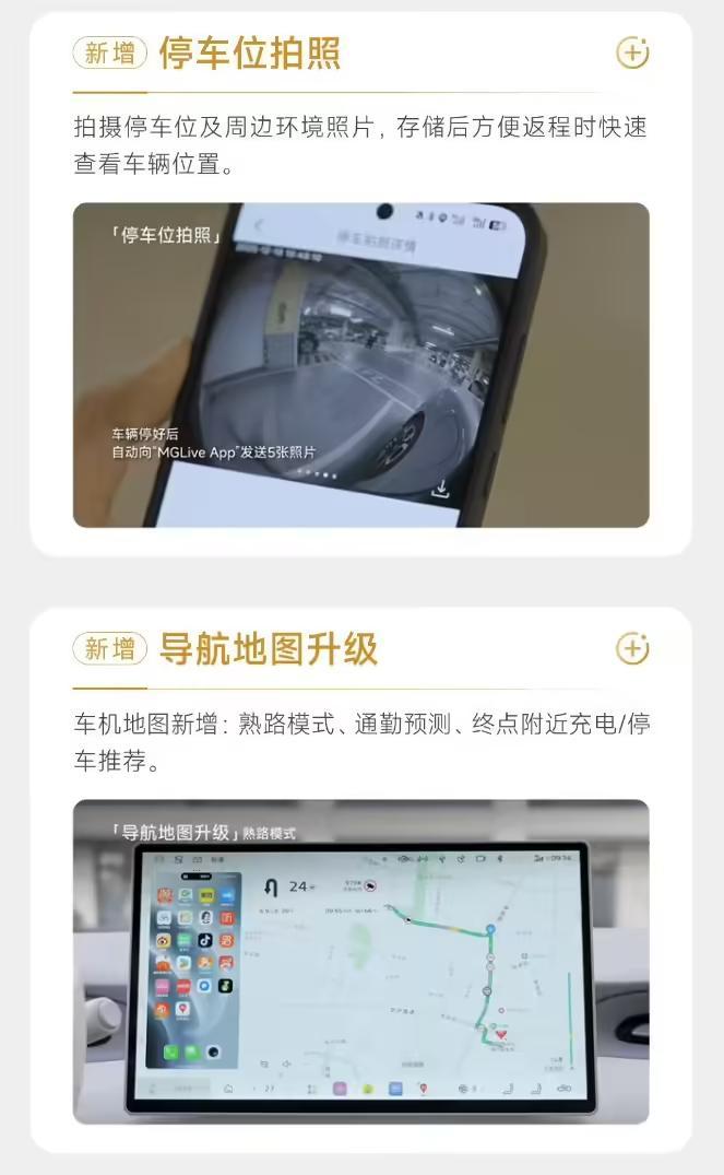 此外,新增的离车自动泊车功能可在下车后触发,车辆自行完成泊入操作,适合狭窄车位或复杂环境使用。停车完成后,停车位拍照功能会在车辆上锁时自动记录周边环境影像,并同步至 MG Live App,帮助用户在不熟悉的停车场快速定位车辆位置。与此同时,个性化车外语音功能也正式开放,用户可根据需要设置语音提示,如行人提醒或锁车提示。