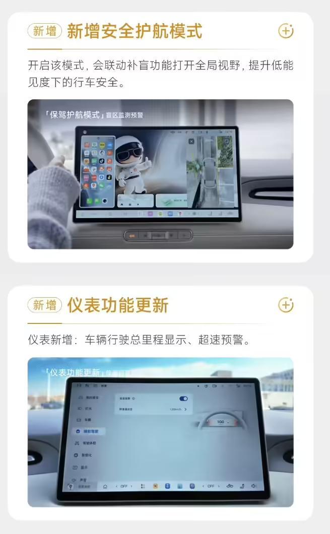 在行车安全方面,本轮 OTA 特别强化了复杂环境及驻车场景下的风险预防能力。AI 智慧补盲功能可为驾驶者实时呈现盲区影像,新增的余光感知功能会在车辆侧后方出现快速接近的目标时,通过光效提醒驾驶者,降低变道和并线时的风险。驻车状态下,哨兵模式能够通过车身传感器持续监测周围环境,在感知到人员或车辆靠近、划车、开门碰撞、异常震动等风险时录制视频,并在风险等级较高时通过手机 App 提醒车主,进一步保障车辆安全。