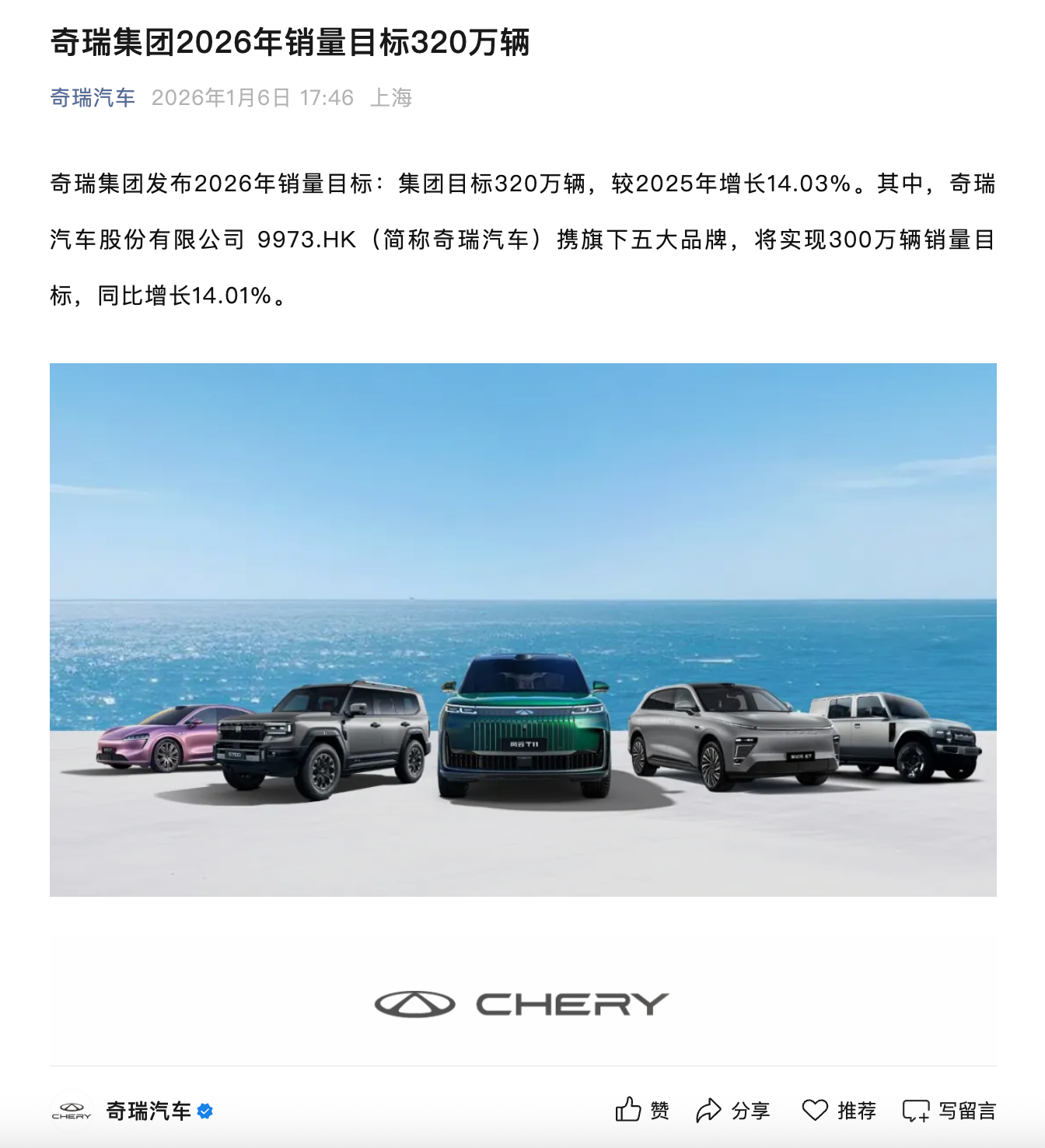 凤凰网科技讯 1月6日,奇瑞集团发布2026年销量目标:集团目标320万辆,较2025年增长14.03%。其中,奇瑞汽车股份有限公司9973.HK(简称奇瑞汽车)携旗下五大品牌,将实现300万辆销量目标,同比增长14.01%。