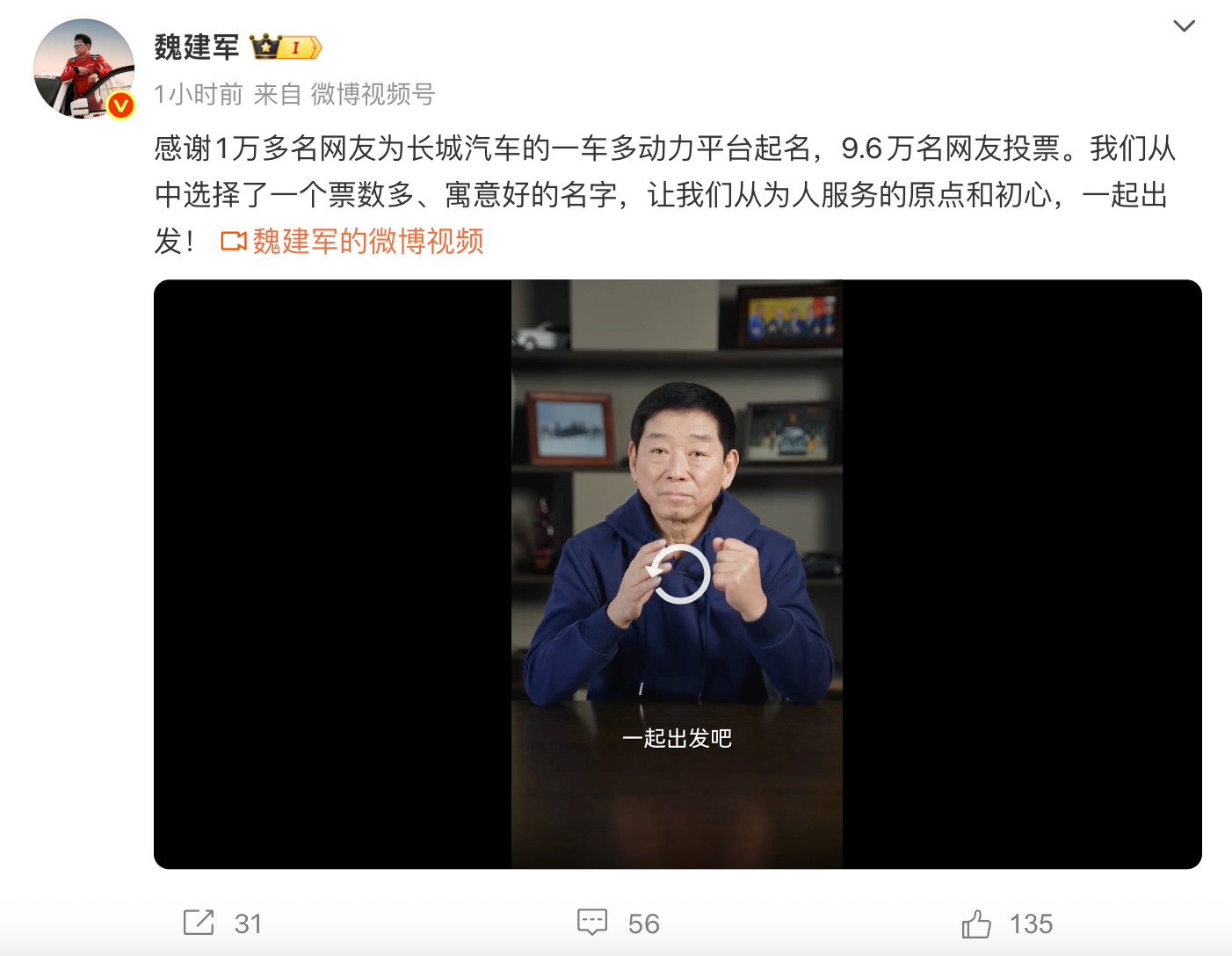 魏建军提到,选择“归元”符合第一性原理,车还是要回归到为人服务的原点。长城汽车官方微博表示,回归本源,共溯初心,“归元”平台将成为全球智能出行的生态底座。