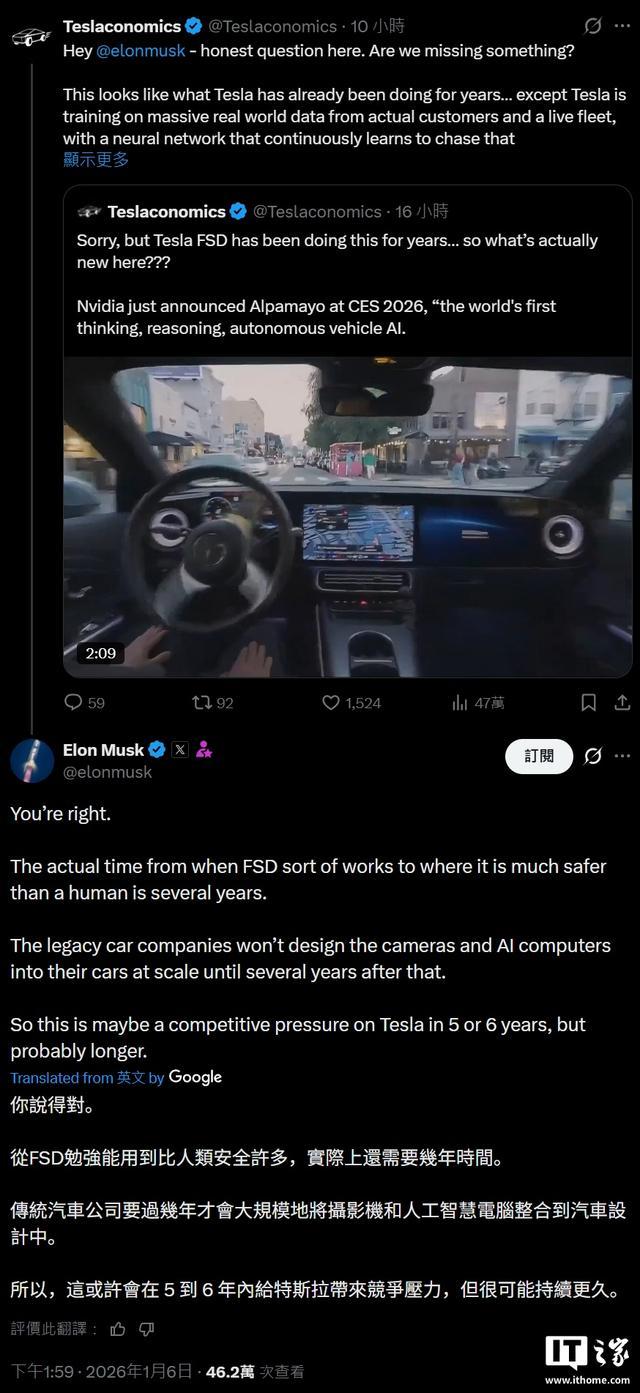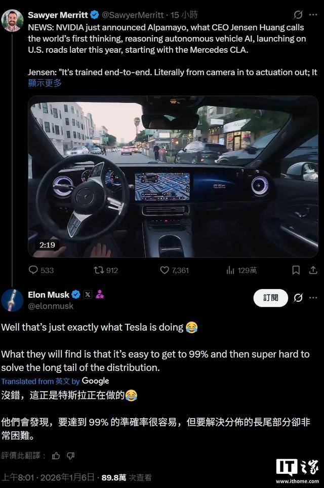 IT之家 1 月 6 日消息,据汽车媒体 TeslaRati 今天报道,英伟达在 CES 2026 发布 Alpamayo 自动驾驶模型后,不少网友跑到 X 平台向马斯克发问,这一举措是否会威胁到特斯拉在自动驾驶领域多年的耕耘,甚至可能会宣告 FSD“终结”。