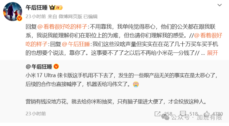 头部合作博主“午后狂睡”更是直接宣布终止年度框架合作,用真金白银的流失向小米施压——“有他没我”。