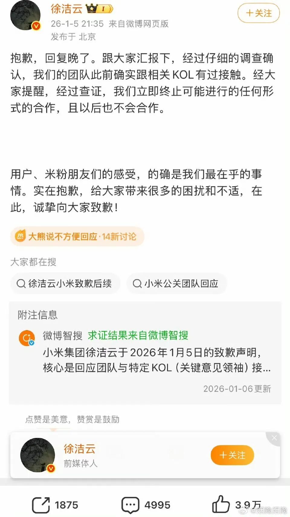除了这则通告之外,徐洁云也在个人的账号发布了致歉声明。