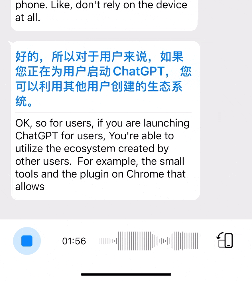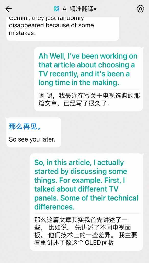 比如我和在英国留学、人工智能专业的 AI 编辑同事聊天,她的英语语速很快,内容里有大量专业术语,但 W4 都能准确翻译——如果没有时空壶,这类对话即便是我听得懂英语,也很难跟上她的节奏,更别说真正理解所有专业内容了。