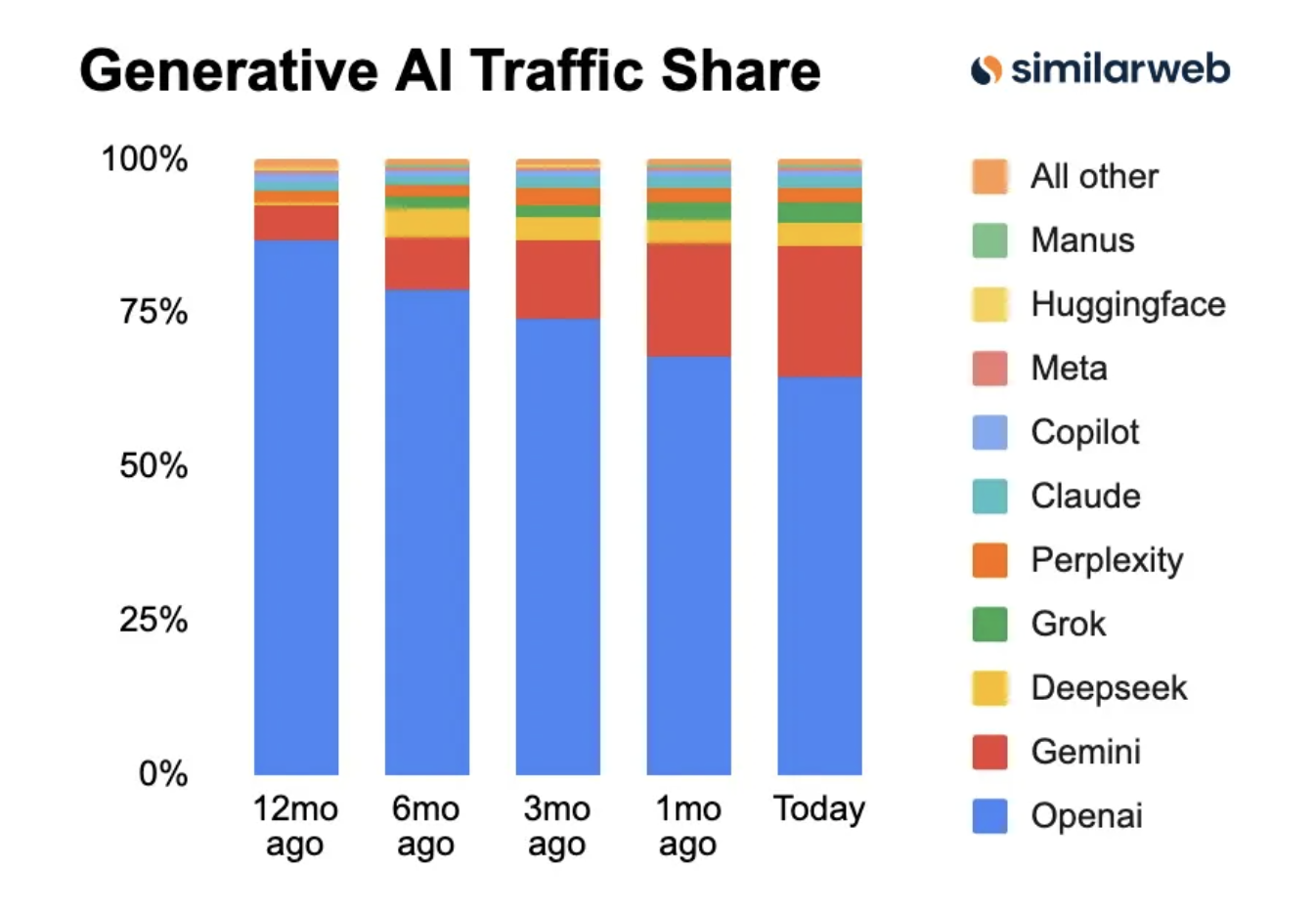根据昨天 SimilarWeb 发布的最新数据显示,2026 年 1 月 Gemini 全球网页端流量份额突破 21.5%;这也是 Gemini 首次突破 20% 的市场份额,而 ChatGPT 的份额从 2025 年 1 月 86% 的统治级水平暴跌至 64.5%。