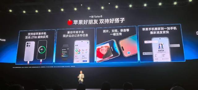 一加Turbo 6支持跨生态互联,官方称为“苹果手机最好的搭子”,Turbo 6可以和苹果手机碰一碰快速分享、同步苹果手表运动记录,还能跨设备接受来电通知等。