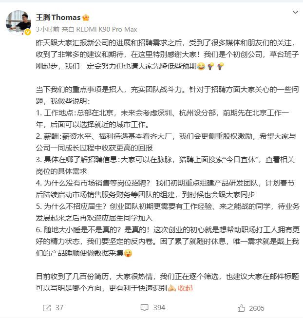 关于为何不招应届生,他解释称,目前正重点组建产品研发团队,计划春节后陆续启动市场销售服务财务等团队的组建。“创业团队初期更需要有工作经验、来之能战的同学,待业务发展起来之后再欢迎应届生同学加入。”