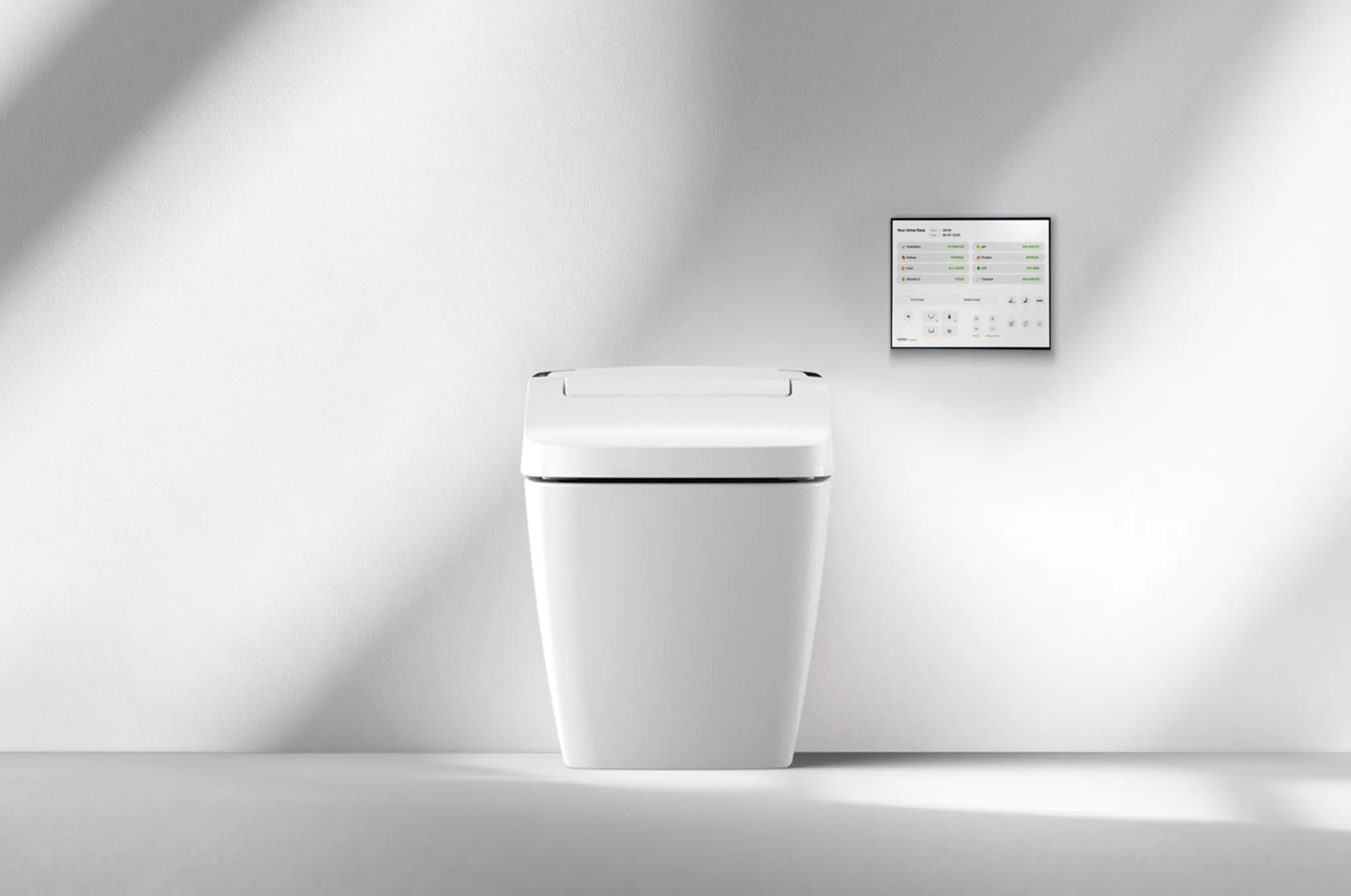 无独有偶,另外一家公司也推出了一个 AI 马桶,更离谱的是,它还配套了一块显示屏挂在墙上,马桶内置的尿液分析传感器,在进行实时监测后,会把结果直接显示在这块壁挂式显示器上。