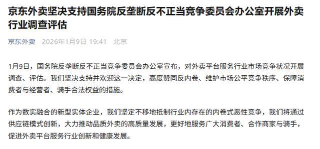 IT之家 1 月 9 日消息,京东外卖今晚发文公告称,坚决支持国务院反垄断反不正当竞争委员会办公室开展外卖行业调查评估。