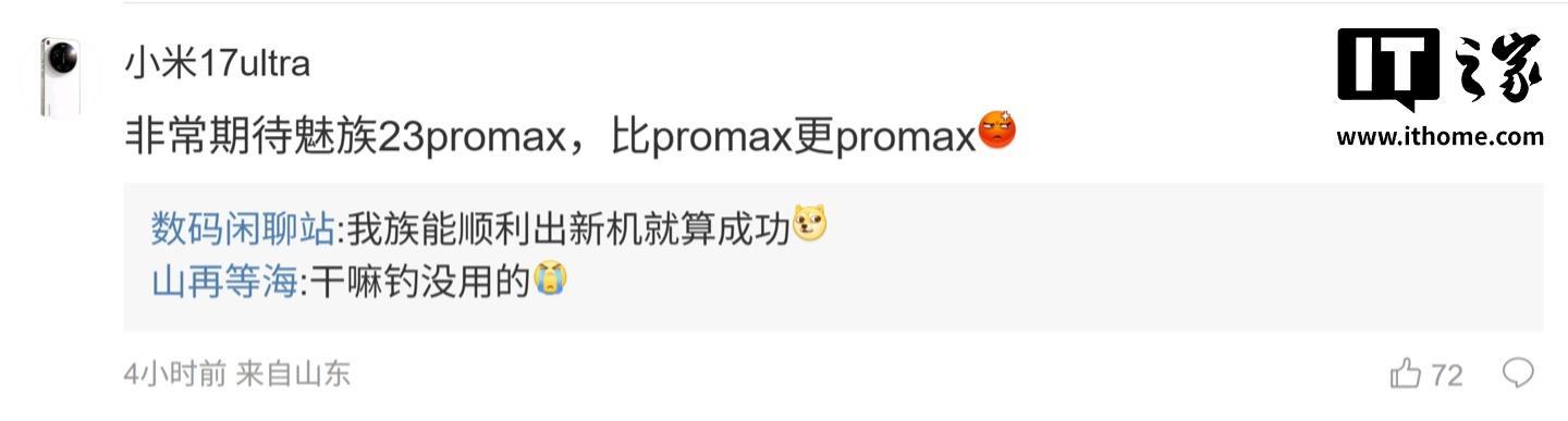 后续有用户在评论区询问:“各家下代都是标准版,pro,pro max 和 ultra?”,博主回复道:“嗯,差不多是这个格局”;另一名用户则表示:“非常期待魅族 23promax,比 promax 更 promax”,博主则回复道:“我族能顺利出新机就算成功”。